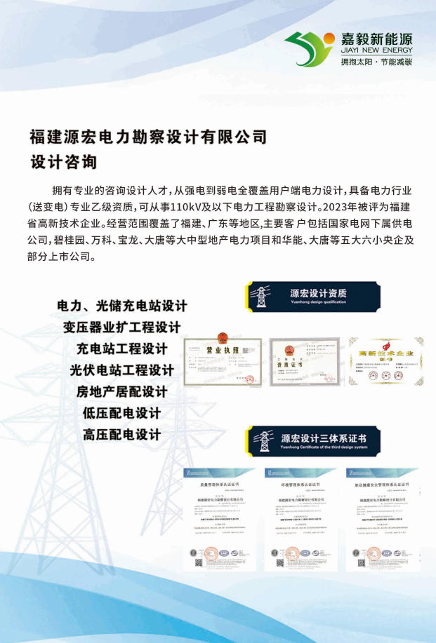 设计咨询依托旗下福建源宏电力勘察设计有限公司,我们拥有电力行业(送变电)专业乙级资质,可从事110kV及以下电力工程勘察设计。从强电到弱电,从户用光伏到工商业分布式电站,我们的专业团队为您提供从咨询到设计的全覆盖服务。